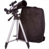 Оптическая труба Levenhuk Skyline Travel 50 в два короче, чем у большинства других рефракторов. Вес конструкции максимально снижен, при этом сохранены все оптические возможности. Поэтому этот телескоп прекрасно подходит для загородных наблюдений – путешествовать с ним сможет даже ребенок. Труба покоится на азимутальной монтировке и алюминиевой треноге. Монтировка проста в управлении, для наведения на объекты достаточно просто переместить ее по высоте и азимуту. Высота ножек треноги регулируется, что позволяет быстро адаптировать телескоп под рост наблюдателя. Levenhuk Skyline Travel 50 станет настоящей находкой для путешественника. Он легкий и компактный, а в комплект входит рюкзак для перевозки.